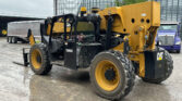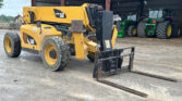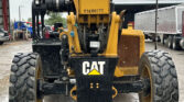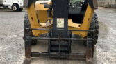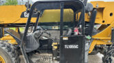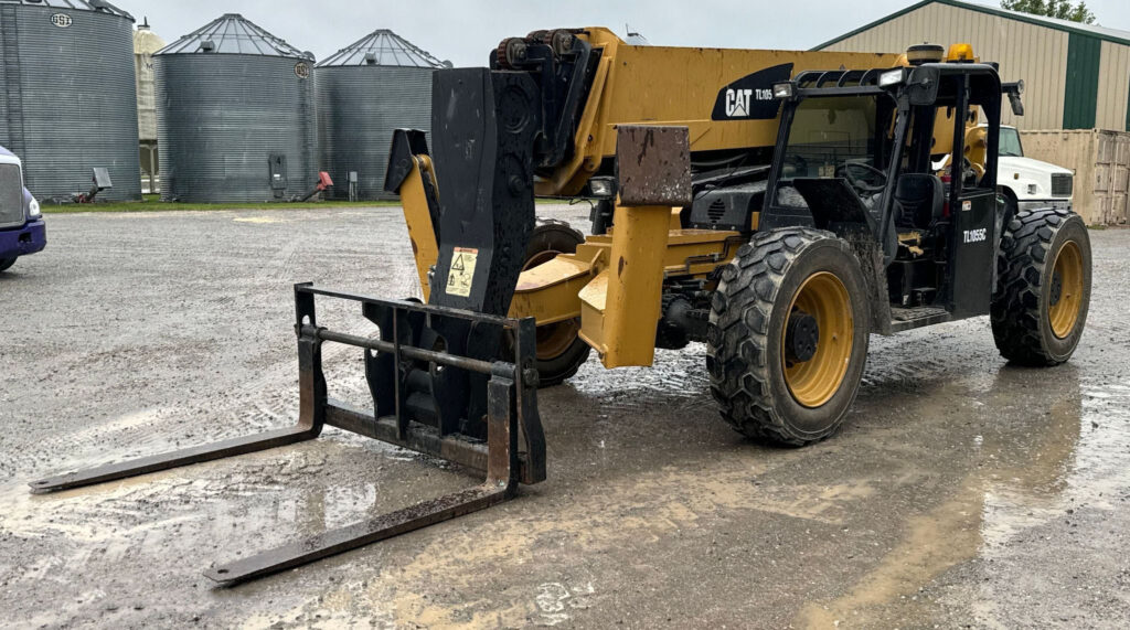 2013 Caterpillar TL1055C telehandler with 4,636 hours (hour meter replaced at 4,435). Powered by a 4-cylinder diesel engine and powershift transmission (4F-4R) with four-wheel drive and multiple steering modes (crab, four-wheel). Features a 10,000 lb lift capacity, 56′ max lift height, 60″ forks, 4-stage boom, auxiliary hydraulics, tilt carriage, and hydraulic outriggers.