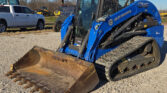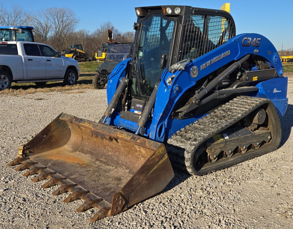 2024 New Holland C345 tracked skid steer loader with 618 hours. Powered by a 4-cylinder diesel engine and hydrostatic transmission with two-speed travel. Features an enclosed cab with AC, heat, backup camera, hand-operated bucket control, pattern changer, and electronic monitoring system. Equipped with auxiliary hydraulics, auxiliary electrical outlet, hydraulic quick coupler, and an 82″ wide bucket with weld-on cutting edge and teeth. Comes with 17″ wide tracks.
